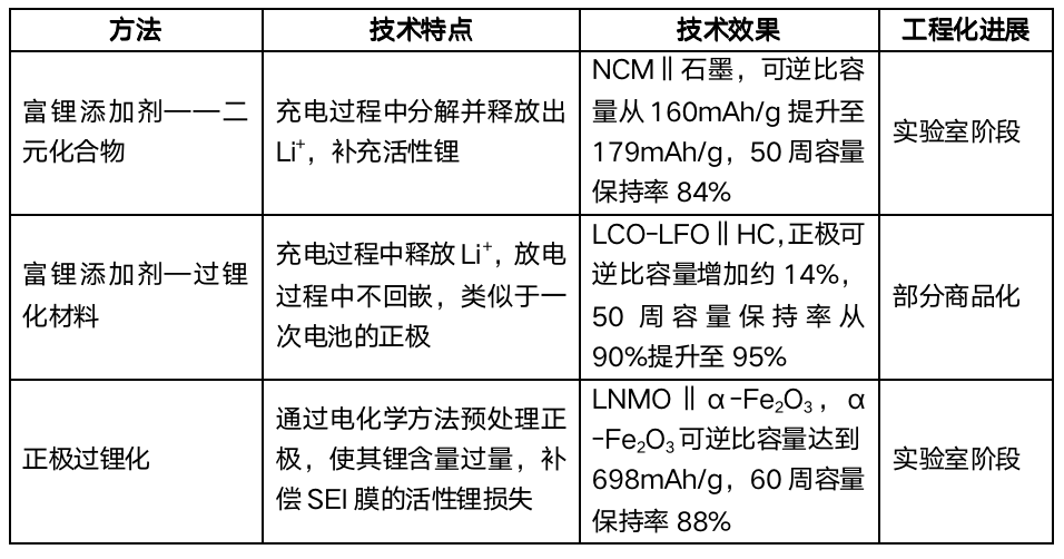 正極預(yù)鋰化是指通過額外添加的活性鋰源,來補(bǔ)償不可逆的活性鋰損失,確保電池內(nèi)活性鋰的充足。相較于流程復(fù)雜?安全風(fēng)險高,且對環(huán)境和工藝要求較高的負(fù)極預(yù)鋰化技術(shù),目前研究較多的正極預(yù)鋰化技術(shù)集中在高性價比的富鋰添加劑開發(fā)方面。
